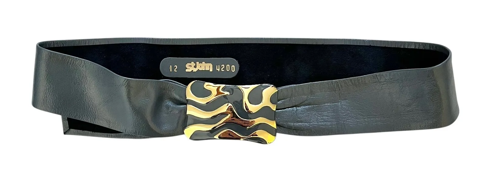 Stunning statement belt from luxury label St. John, circa 1980s. Wide gray leather strap. Gold-tone buckle plate with textured abstract design on front. Adjustable sizing with hidden hook and loop closure on buckle. Fits at waist or on hip. Great vintage condition. Leather recently cleaned and conditioned. No cracking or stains. See all photos. Size Vintage 12 = Modern Medium (fits up to 32” waist) Strap width: 2" Adjustable sizing: Up to 32"