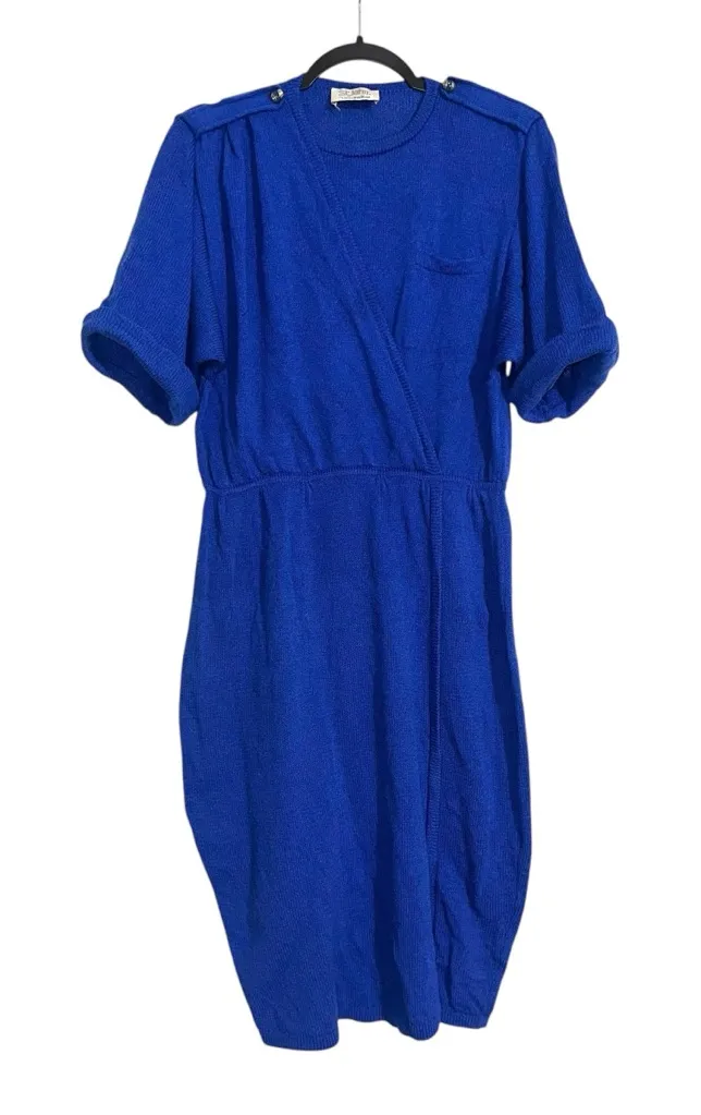 Chic and stylish midi dress. Features a vibrant royal blue hue. Perfect for any occasion. NOTE: no size tag, size is proximate for better fitting see measurements. Some staining in the front as seen in picture Features Faux wrap Elastic waistband Roll sleeves Side slit Pull-on style Unlined Knee length Size: 10 Color: Blue Material: No material tag Chest: 18.75 in Waist: 14.75 in Length: 41 in Measurements are proximate laying down flat