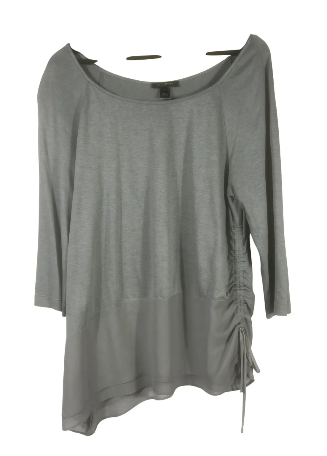Crafted from luxurious viscose with a silk bottom panel and drawstring, this blouse combines understated elegance with modern style. Featuring a scoop neckline, 3/4 sleeves, and an asymmetrical layered hem with ruched side detail, it's perfect for both casual chic and polished office looks. A timeless piece from St. John, known for refined craftsmanship and classic silhouettes. • Material: 100% Viscose (body), 100% Silk • Care: Dry Clean Only • Made in: Mexico • Condition: Pre-owned, excellent condition with no noted flaws Approximate Measurements (flat): • Pit to Pit: 18.5" • Length: 28" & 31" Pair it with slim trousers, skirts, or jeans for a look that is both effortless and elevated. Minimalist, Quiet Luxury, Modern Classic, Elevated Basics, Chic Office Wear, Effortless Elegance, Neutral Tones, Capsule Wardrobe
