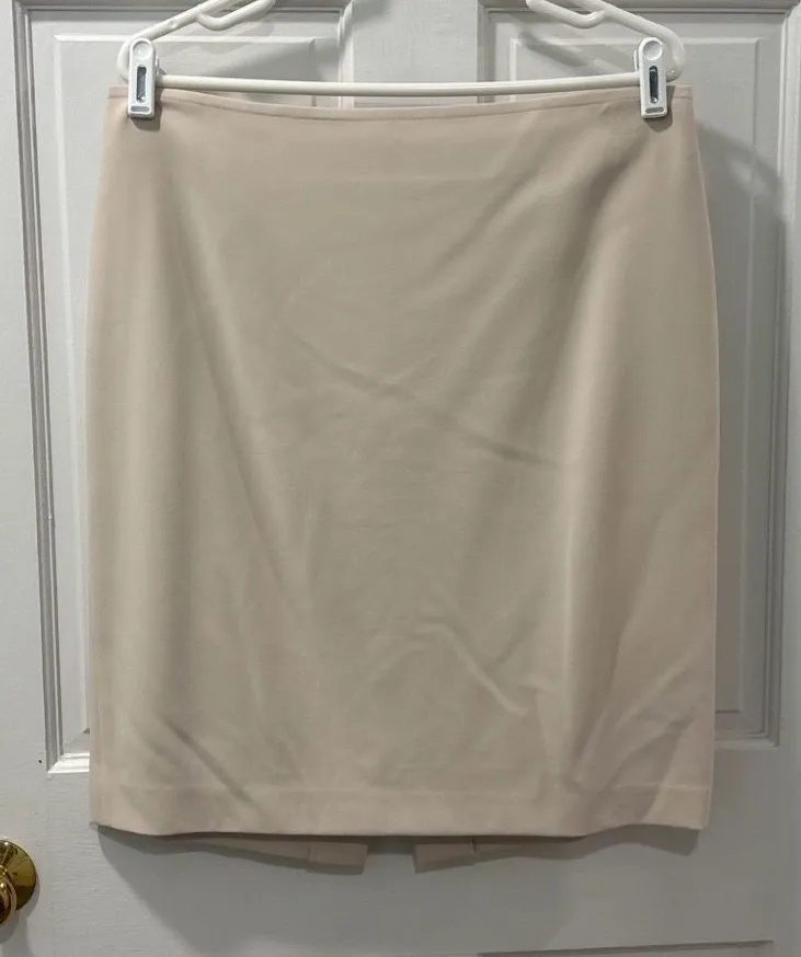 St. John women’s silk lined pencil skirt, size 12 in ivory/light tan. It is in excellent condition, perfect for career/office wear, semi formal events, church, special occasions and much more. It’s a great neutral basic and is stretchy and comfortable. Back zipper closure and small slit in the center of the back hem. Measurements: Waist laying flat: 17.5” Length: 22.5”