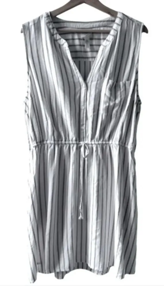 Keywords: sleeveless dress, white dress, striped dress, casual dress, summer dress, knee-length dress, V-neck dress, button-down dress, adjustable waist, women's fashion, lightweight fabric, machine washable, pre-owned dress, 2XL dress, Prairie, boho, bohemian, cottagecore, hippie, granola girl, farmhouse, farm, farmcore, woodsy, rustic, romantic, flowy, soft, plus size, size 20-22, neutral, demure