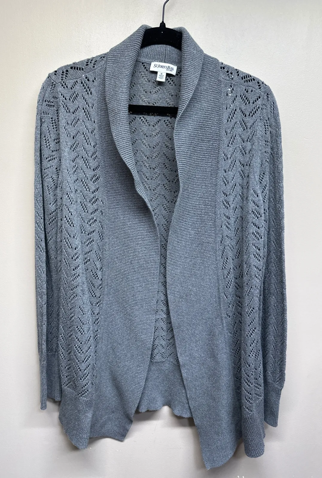 St Johns Bay gray knit open front cardigan sweater. Intricate open-weave detailing on the front and... Show more