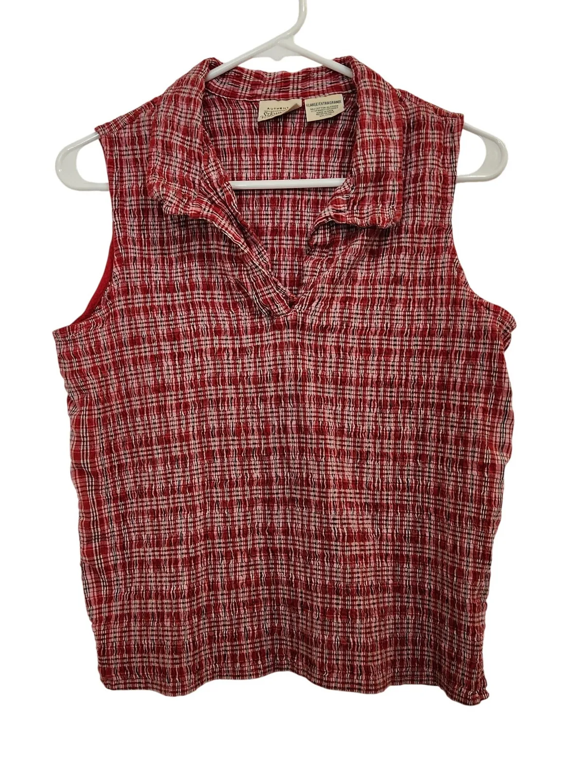 Great used condition Embrace an effortless, breezy aesthetic with this red plaid sleeveless polo, d... Show more