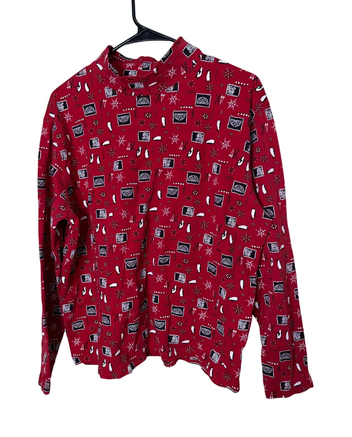 A women's long sleeve mock neck top in a festive red with a playful pattern. This top showcases a un... Show more