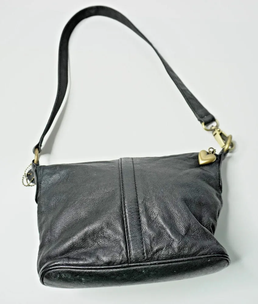 VTG Y2K Genuine Leather Black Shoulder Bag Purse Gold Brass Heart Charm Retro * 2000s 90s pebbled ne... Show more