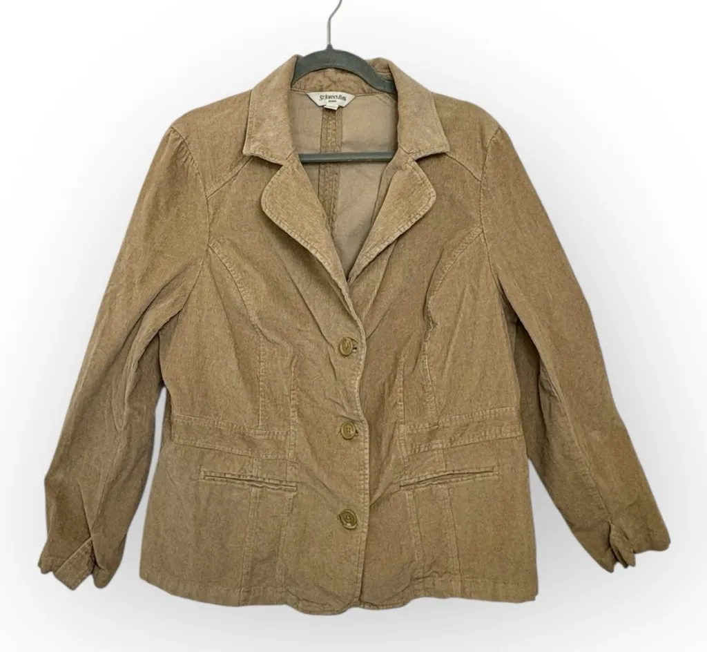 A tailored tan corduroy blazer with a three-button front, subtle shaping seams, and welt pockets. A... Show more