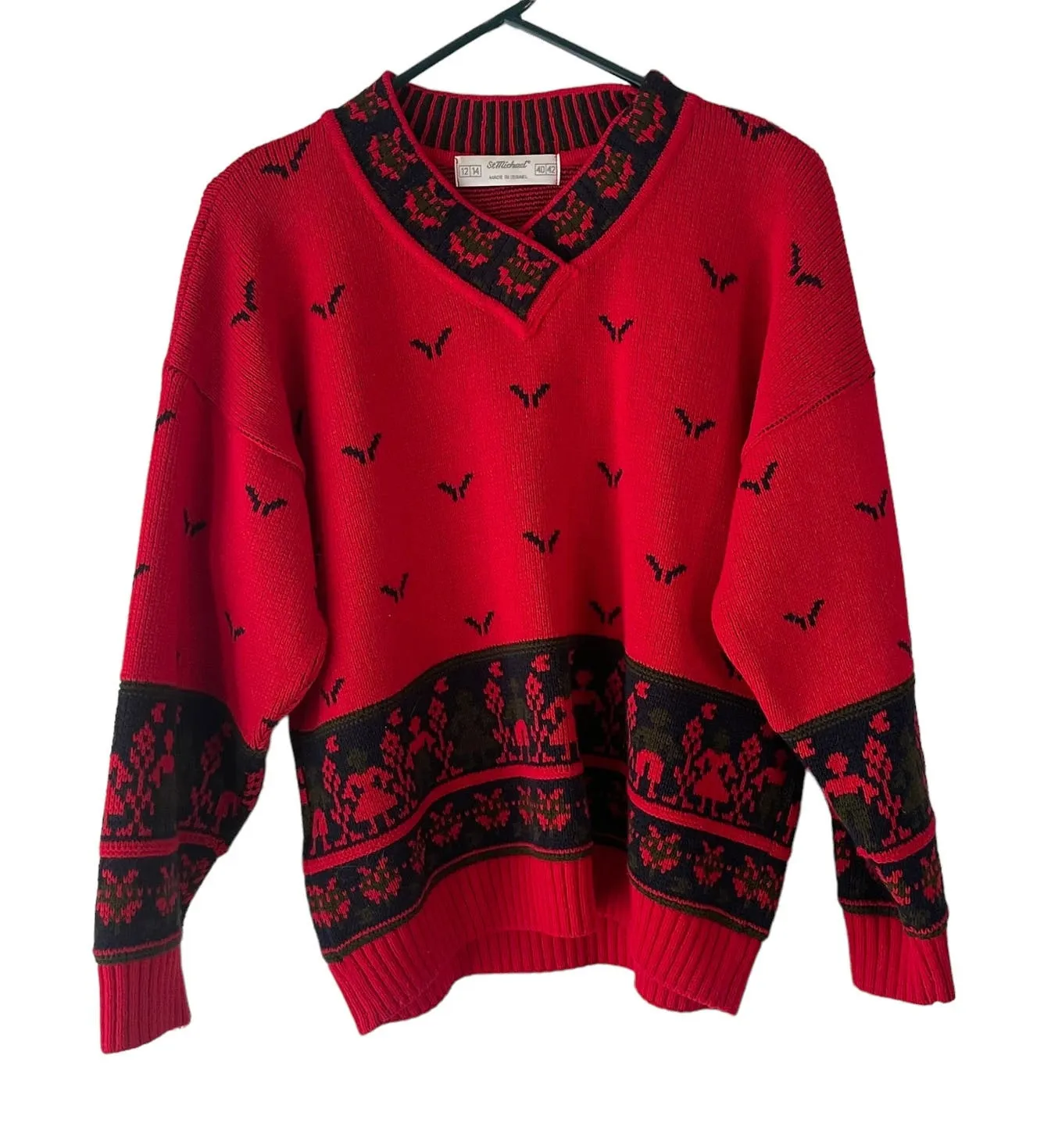 Step back in time with the St. Michael Vintage 90s Women's Size XL Israel Red Novelty Knit V-Neck Sweater, a charming and nostalgic piece that adds a touch of retro flair to your wardrobe. Crafted with care, this vintage sweater features a unique novelty knit design in vibrant red, evoking memories of '90s fashion nostalgia. The V-neckline adds a classic touch, while the oversized fit provides comfort and effortless style. Long sleeves, V neckline, Ribbed hem and cuffs, Black print in red background. Item is in very good preloved condition! All Measurements, and material content tags are in the photos. Pit to pit: 21" Neck to hem: 23" Thank you for your interest in this item! Tags: Holiday, Outdoor, Vintage, Israel, Art, 90's