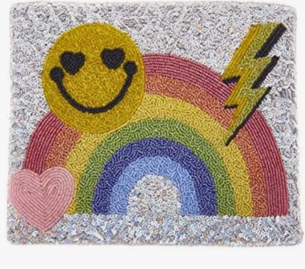 Basically new condition. Has only been kept in closet. Make a statement with this any occasion super fun and bright handbag. Emoji social icons of happy face, lightning bolt, heart and rainbow. Has removable optional strap to use as clutch or with it attached as a shoulder purse or crossbody bag. Nice craftsmanship. Measures 10” wide by 8.5 tall.