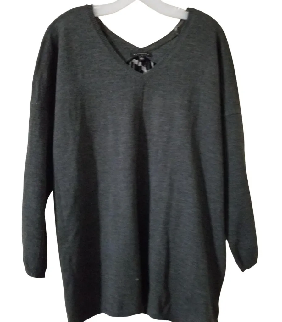 This Staccato sweater combines elegance with comfort, featuring a sophisticated gray knit front and a striking black plaid back detail. Its long sleeves and V-neck design create a versatile look, suitable for layering or wearing solo. The blend of patterns and textures adds depth, making it a unique addition to any wardrobe. • V-neck design for a flattering neckline • Long sleeves for added warmth • Contrasting plaid back panel for visual interest • Lightweight knit fabric for year-round wear No visible flaws Features: Sweater Size: Womens L Great Pre Loved Condition Smoke Free * Pet Friendly Home 59 - 1208 gray plaid sweater, long sleeve knit, v-neck sweater, staccato clothing, plaid detail sweater, casual knitwear, lightweight sweater, women's sweater, gray black top, plaid back sweater, trendy women's top, fall fashion sweater, oversized knit sweater