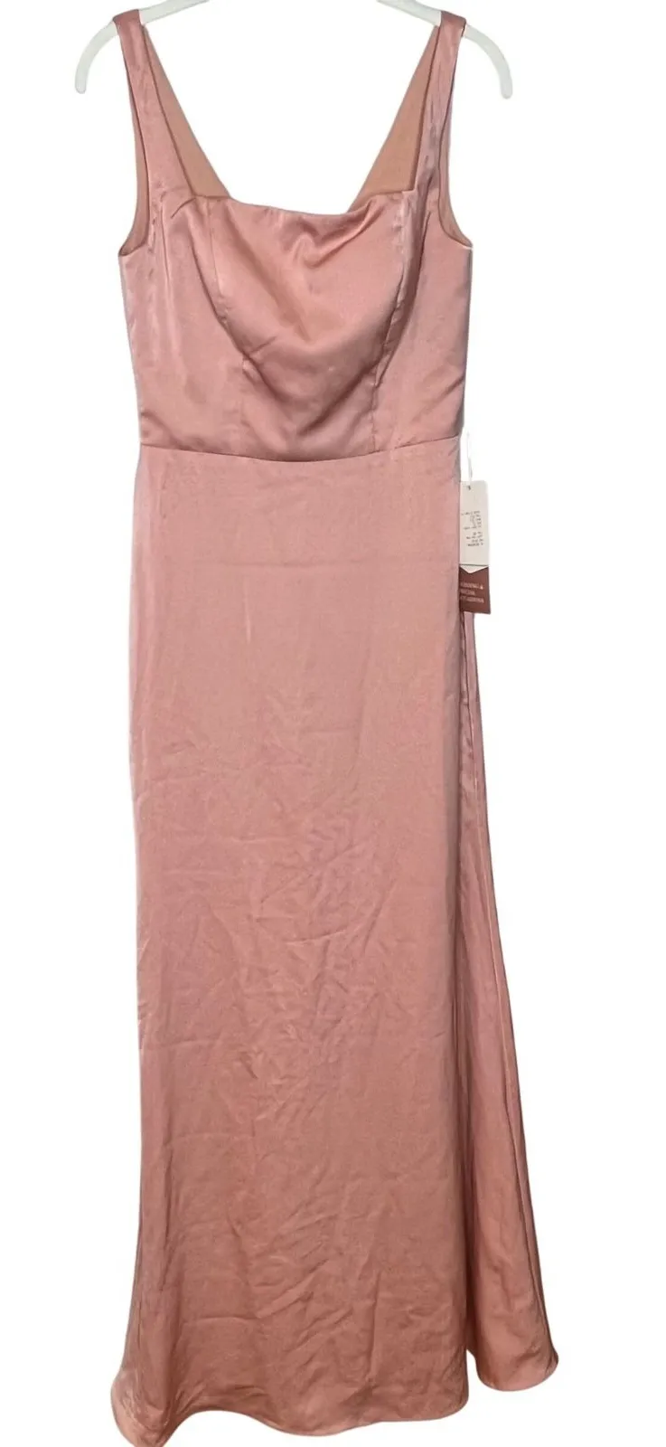 New with tags A STACEES dusty rose satin maxi dress with a cowl neckline and a flattering A-line silhouette. This elegant gown features a sleeveless design with wide straps and a zip closure in the back. The smooth satin fabric drapes beautifully, creating a sophisticated look perfect for formal events. V Back. Padded bust. Measurements are on the tag photo Keywords: bridesmaid dress, formal gown, evening wear, special occasion, satin dress, sleeveless dress, cowl neck, A-line dress, dusty rose, long dress, elegant, sophisticated, wedding guest, prom, dances, outdoor wedding, beach wedding