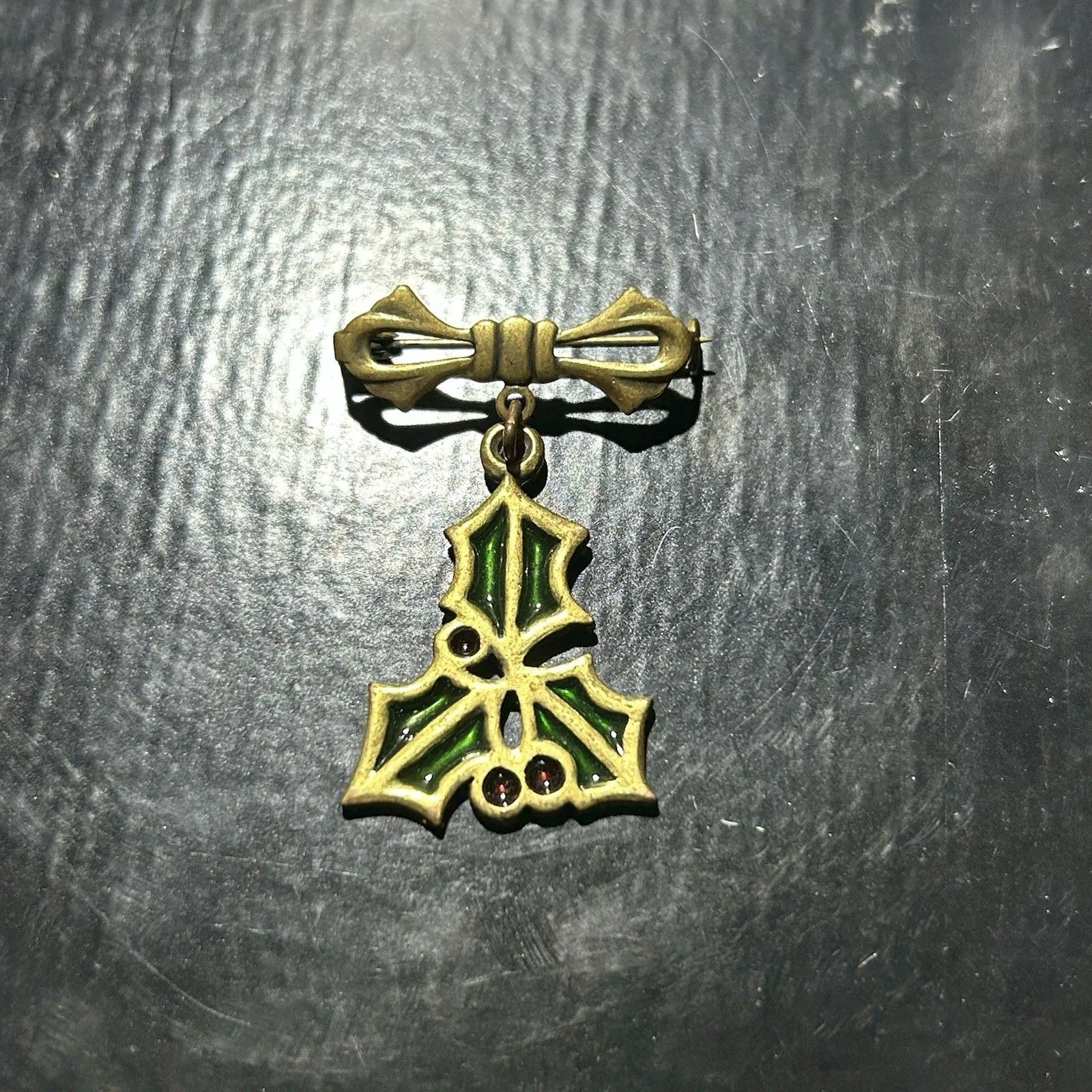 Stained Glass Holly Christmas Brooch Pin Red Green Gold Tone Bow C Clasp - $8 - From Hannah