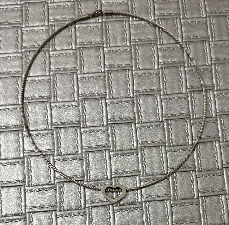 Minimalist stainless steel cable choker necklace featuring a sleek wire band and a delicate cutout heart pendant, modern lightweight design perfect for everyday wear, gifting, layering with other chains, or adding a simple chic touch to any outfit, secure barrel clasp closure, approx. 16” length, durable stainless steel construction that resists tarnish, great for Y2K layered looks, casual outfits, and timeless minimalist jewelry, Y2K core, minimalist core, delicate chic core.