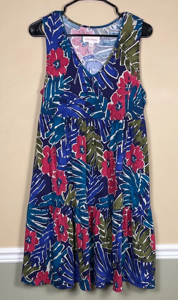 Excellent condition. 60% Cotton; 40%. Various shades of blue, green, pink, purple, and cream. Defined abdomen. A pocket on each side. Tiered bottom. Approximate measurements: Pit to pit - 20” Shoulder to bottom hem - 38”