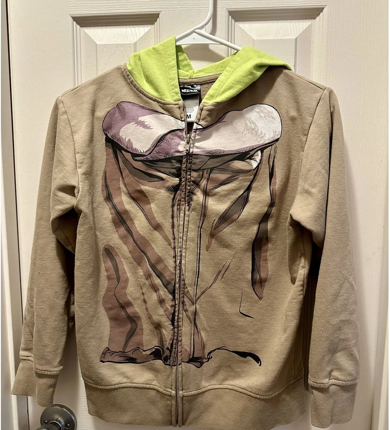 This Star Wars women's hoodie is perfect for any fan of the franchise. It features a full zip closure, long sleeves, and a hood with green Yoda ears. The beige color and accents of a zipper add a touch of style to this activewear sweatshirt. Made from a blend of polyester and cotton, this hoodie is comfortable and durable. It's available in Womens size medium and is in great preowned condition. It shows some slight pilling and wear but is still in great condition.