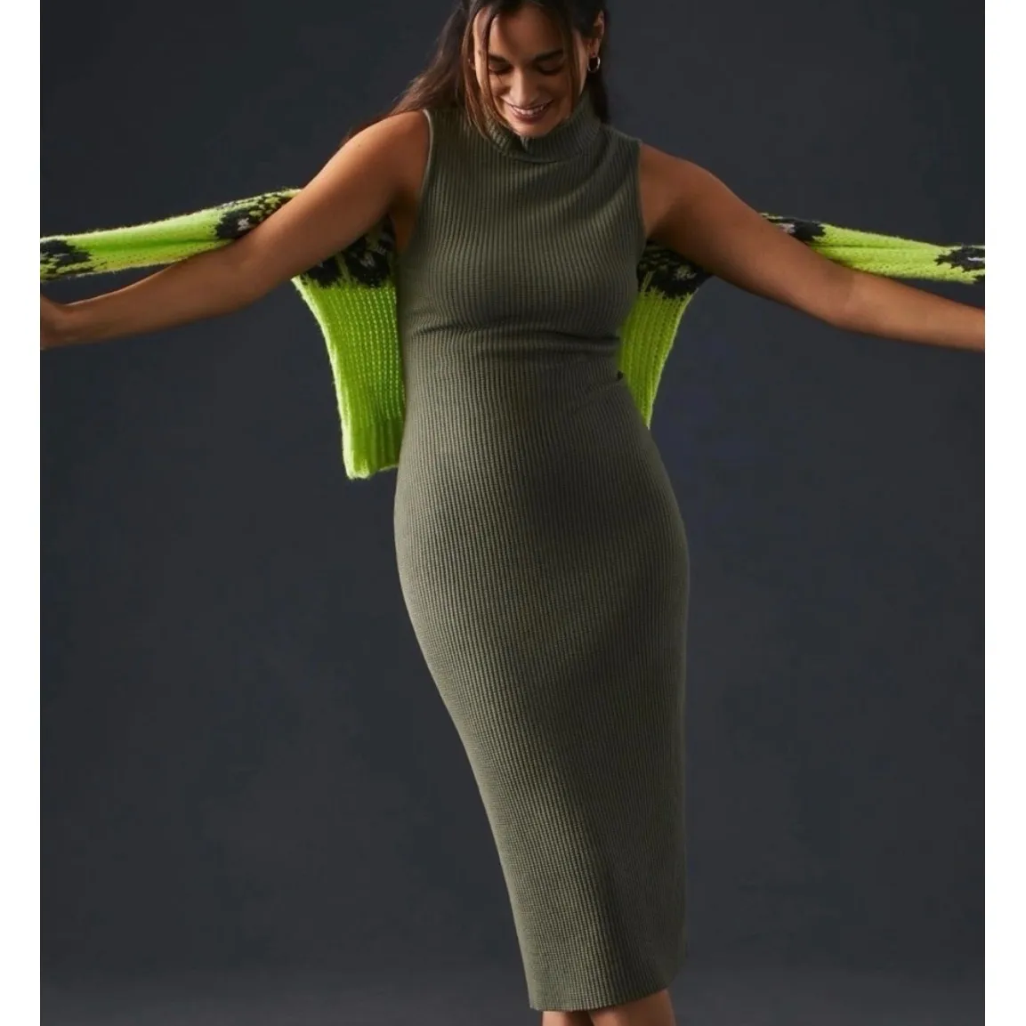 Women's size large. Olive green ribbed sleeveless turtleneck midi dress. This dress features a flatt... Show more