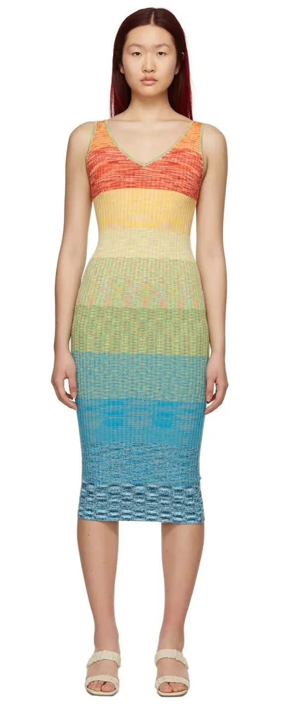 Cut for a close; slim fit; STAUD's ribbed-knit dress is rendered in vibrant hues and is cut to fall to a chic midi hemline. Size: Small Color: Rainbow Multicolor Sleeveless Stripes Ribbed knit Midi length V-neck Rayon, nylon, spandex blend