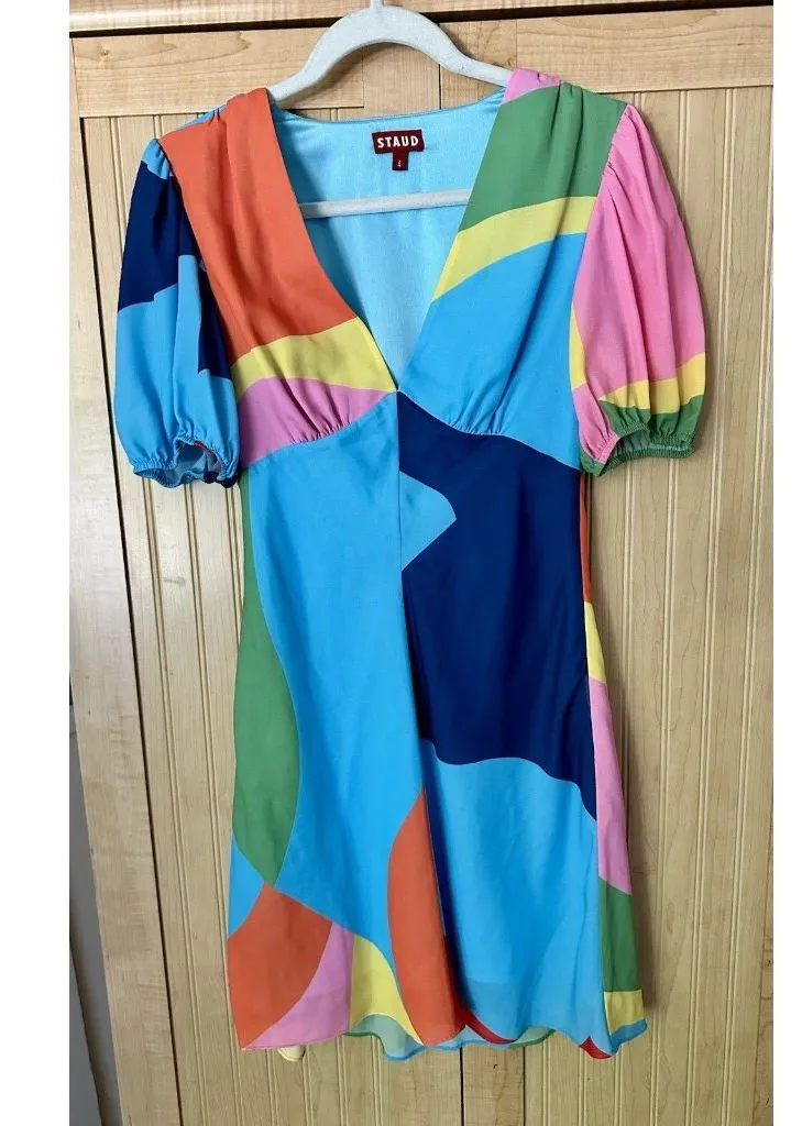 The STAUD Milla Mini Dress in Capri Coastal Marble is a colorful and stylish option for women in size 4. This dress features a geometric pattern, short puff sleeves, a V-neckline, and a zip closure. Made from a blend of polyester, rayon, and viscose, it is perfect for various occasions such as travel, weddings, parties, and casual outings. With its fit & flare style and mini length, this dress is versatile and can be worn in different seasons like winter, summer, fall, and spring, making it a trendy addition to any wardrobe.