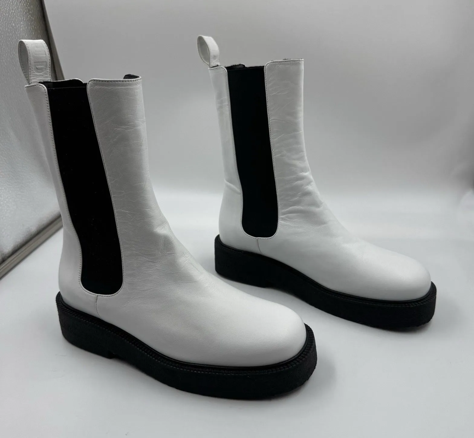 The STAUD Palamino White Leather Black Gore Ankle Chelsea Boots in size 35 are a stylish and versati... Show more
