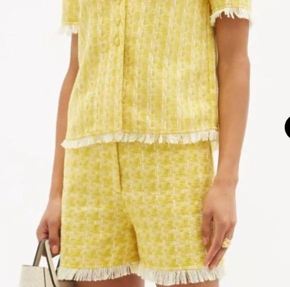 NWOT, Crafter from summer weight tweed that’s fringed at the cuffs, patched with work wear inspired back pockets Waist-17”, Inseam-4”, Rise-13” 90% Polyester, 10% Cotton Lining-100% Cotton