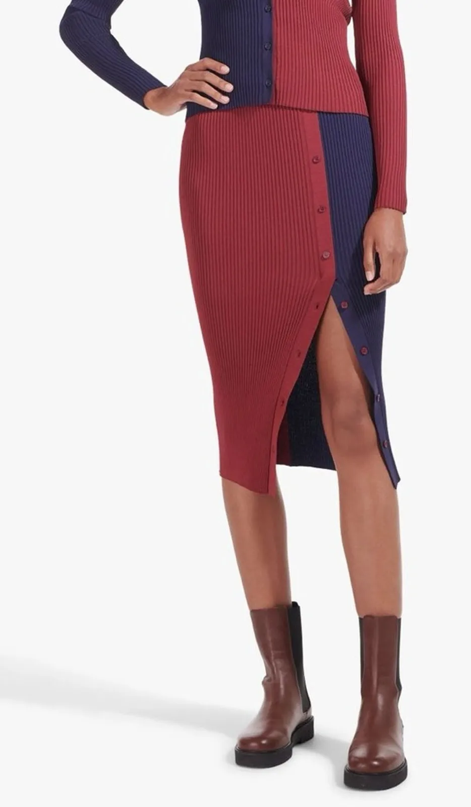 Staud Women’s Elms Color Block Two Tone Navy Bordeaux Knit Button Midi Skirt Size Small Great preo... Show more
