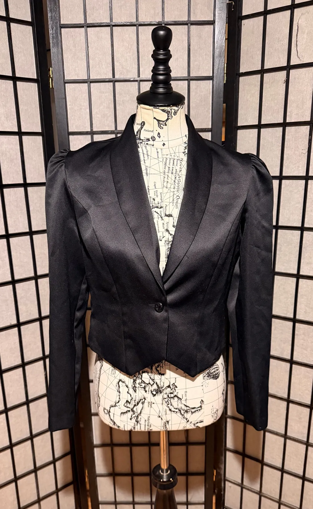 Stefano Vintage Satin Crop bolero y2k Whimsygoth formal evening Elegant cropped Blazer This sophisticated black blazer is perfect for any occasion. Its sleek design offers a timeless look that pairs well with any outfit. Good