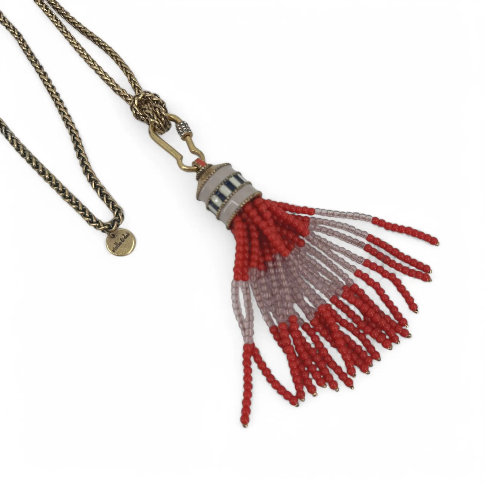 Stella & Dot retired "Brio" necklace in coral red Features an oversize beaded tassel on a fancy gold tone chain Necklace measures 30" long In gently used condition with light wear
