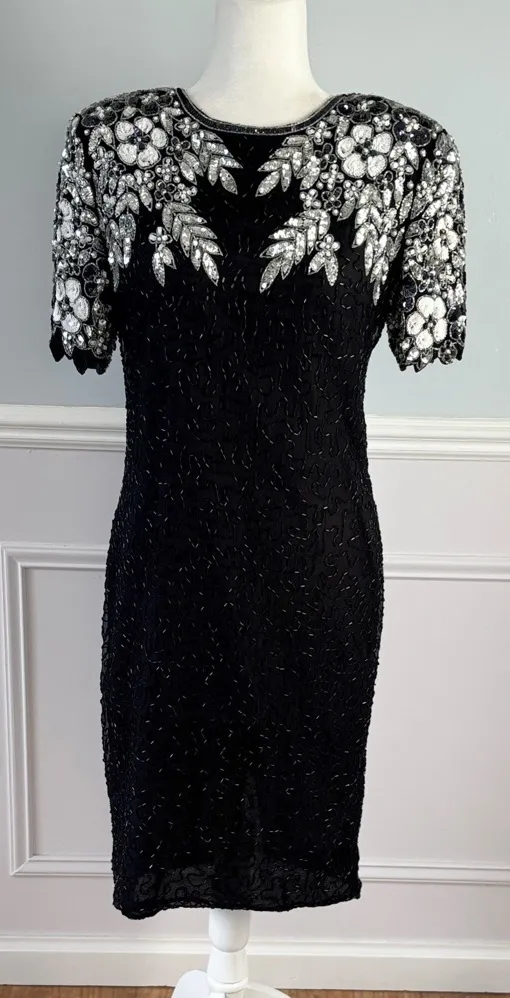 GREAT VINTAGE CONDITION; little to no sign of wear * BRAND: Ste'nay * SIZE: 10 * Vintage from the 1980s * Materials: silk * Introducing a glamorous 1980s black beaded dress that exudes sophistication and flair. * This eye-catching piece is intricately adorned with shimmering silver-white pearls and striking black sequins, creating a stunning visual effect that catches the light beautifully. * The dress features chic short sleeves * Includes shoulder pads * Peep back, adding an element of allure to its design. * A small split at the back enhances its elegance, allowing for ease of movement while maintaining a refined silhouette. * Perfect for a cocktail party or elegant evening event, this dress is a must-have for anyone looking to make a bold fashion statement with a touch of vintage glamour. APPROX., FLAT LAY: * Underarm-to-underarm: 18" * Waist: 16.5" * Shoulder-to-hem: 41"