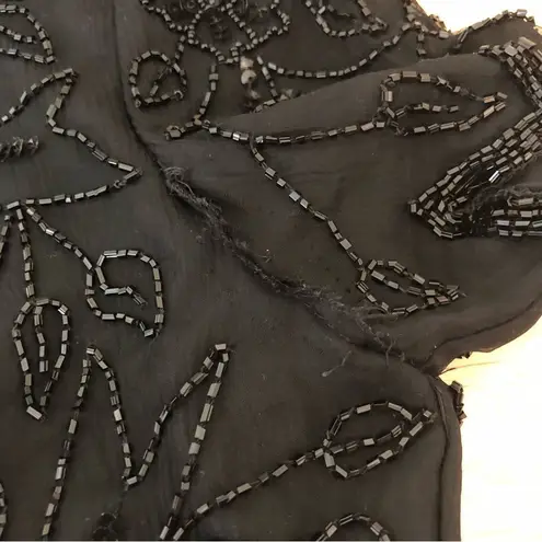 *item is flawed and would be best be used as a costume as opposed to a special occasion event. Silk fabrication with black beads and sequins in a floral/vine pattern, tiered skirt, short sleeves, lined, rounded neckline and back, hidden back zip. Flaws- not a hole, but some separation of fabric at first tier, missing row of beads at chest, under one of the sleeves there is the beginning separation (no hole, just a seam coming undone). Still wearable, and these may be fixable issues if desired.