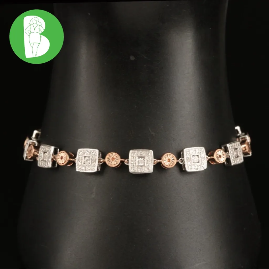 This listing is for the bracelet pictured. JWBR -925 sterling silver with rose gold overlay in areas -circles and square link design -genuine diamond accents with diamond cut detail -diamonds are single cut -.80MM-.90MM each -.25 carat total weight -H-I fancy yellow/brown in color -SI1-SI2 in clarity -lobster claw clasp -total weight of bracelet is 10.50 grams Length of bracelet is 7.5 inches Preowned jewelry may contain minor marks and imperfection