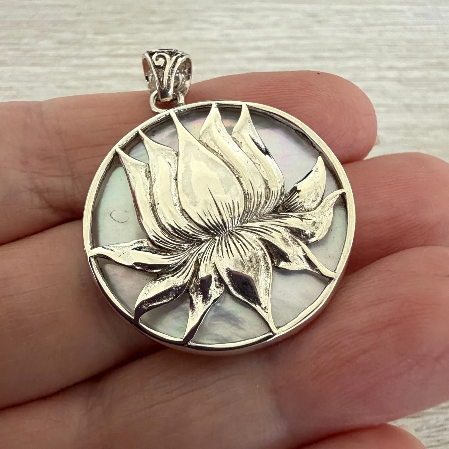 Sterling silver lotus medallion pendant featuring a luminous Mother of Pearl (MOP) shell backing. This elegant piece showcases original artist-created artwork, finely detailed in solid 925 sterling silver. The lotus flower is a timeless symbol of renewal, strength, purity, and spiritual growth, beautifully highlighted by the natural iridescence of genuine mother of pearl. Each pendant reflects subtle shell variations, making every piece uniquely beautiful. This is a boutique-quality, artisan-designed pendant, not mass-produced. Details: • Solid 925 Sterling Silver • Genuine Mother of Pearl (MOP) shell • Original copyrighted artwork • Round medallion design • Pendant size: approx. 30mm round (about 40mm including bail)• Pendant only (chain not included unless added) A stunning statement piece for everyday wear, meditation jewelry, or a meaningful gift.
