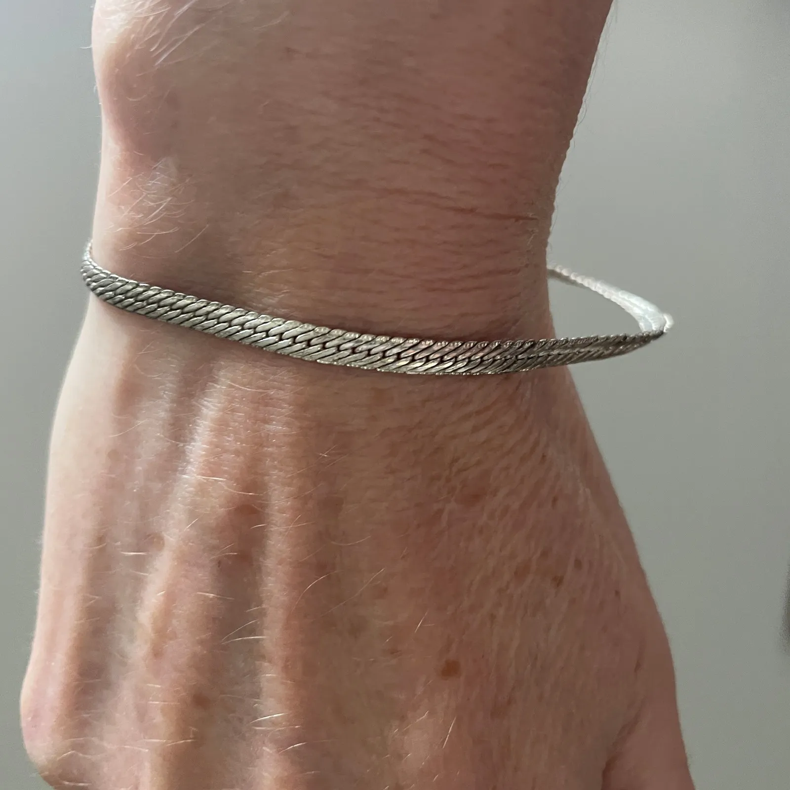 Sterling silver snake chain bracelet offering a sleek and elegant design. This bracelet showcases a finely woven chain that lays flat against the skin, creating a smooth and sophisticated look. The secure clasp ensures it stays in place for comfortable all-day wear. Perfect for adding a touch of understated luxury to your everyday ensemble or for complementing evening attire. Measurements: • Length: 8 in Style: Chain Type: Bracelet Main Stone Color: Silver Main Stone: No Stone Closure: Lobster Chain Type: Herringbone Features: Adjustable Era: Undated Keywords: silver bracelet, snake chain, delicate bracelet, minimalist jewelry, everyday wear, gift for her, stackable bracelet, fashion accessory, lightweight jewelry, evening wear, classy accessory, dainty bracelet Sterling Silver Snake Chain Bracelet Thin Elegant Unisex Jewelry Minimalist Y2K