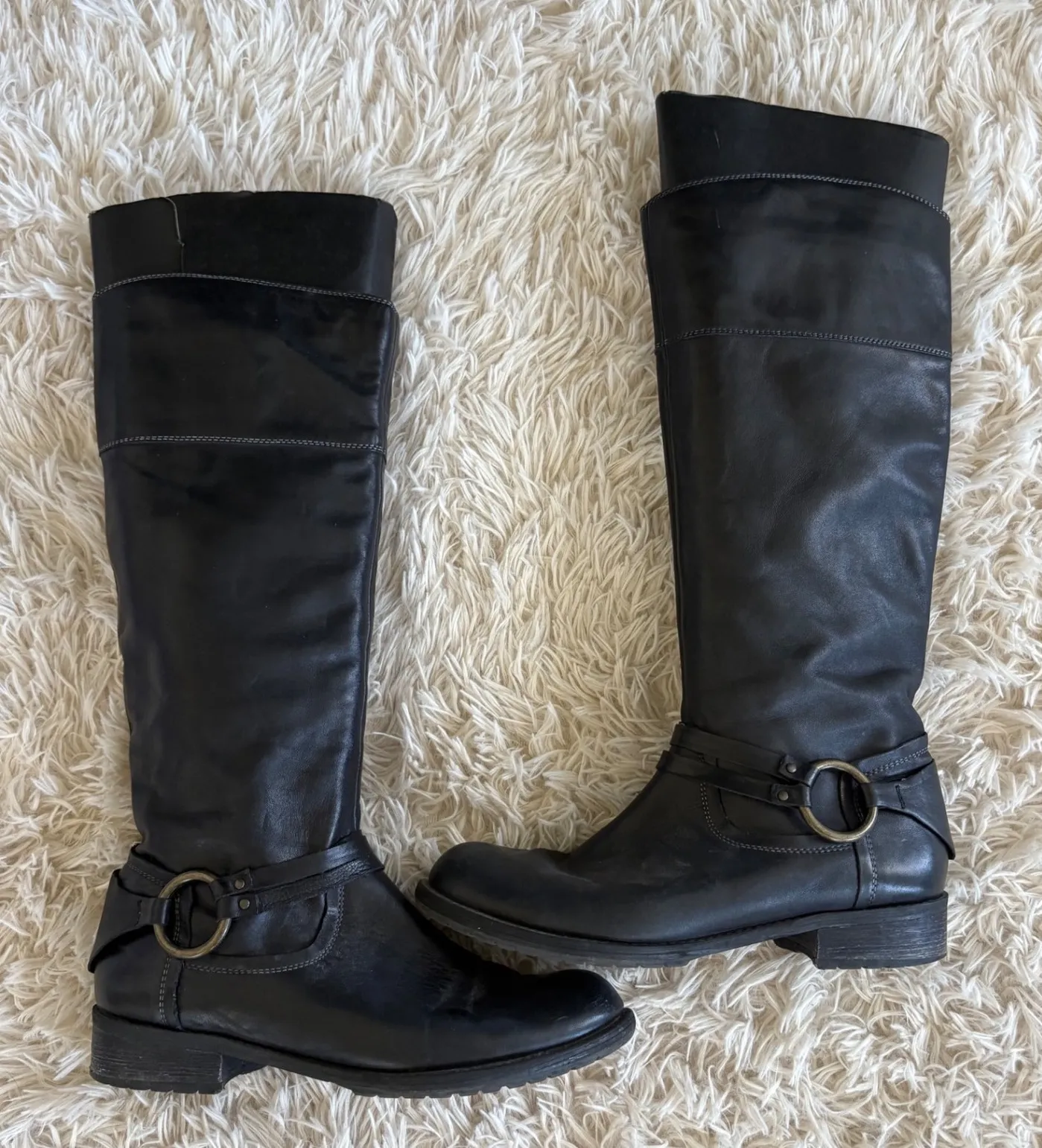 Keywords: black leather boots, womens knee high boots, riding boots, moto boots, buckle detail boots, tall boots, leather footwear, fashion boots, sidny boots, size 7 boots, winter boots, autumn boots, casual boots, dressy boots, comfortable boots