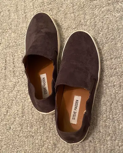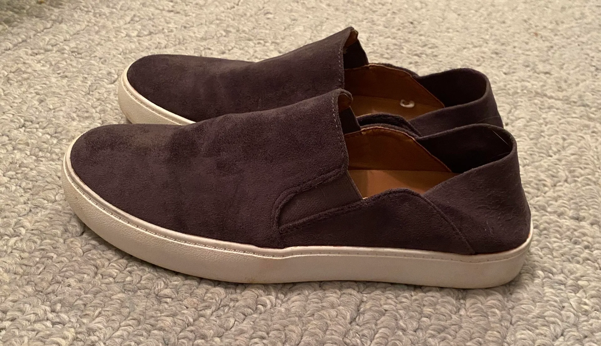 Buttery soft suede slip-on shoes Dark gray with white soles Small scuff on one shoe