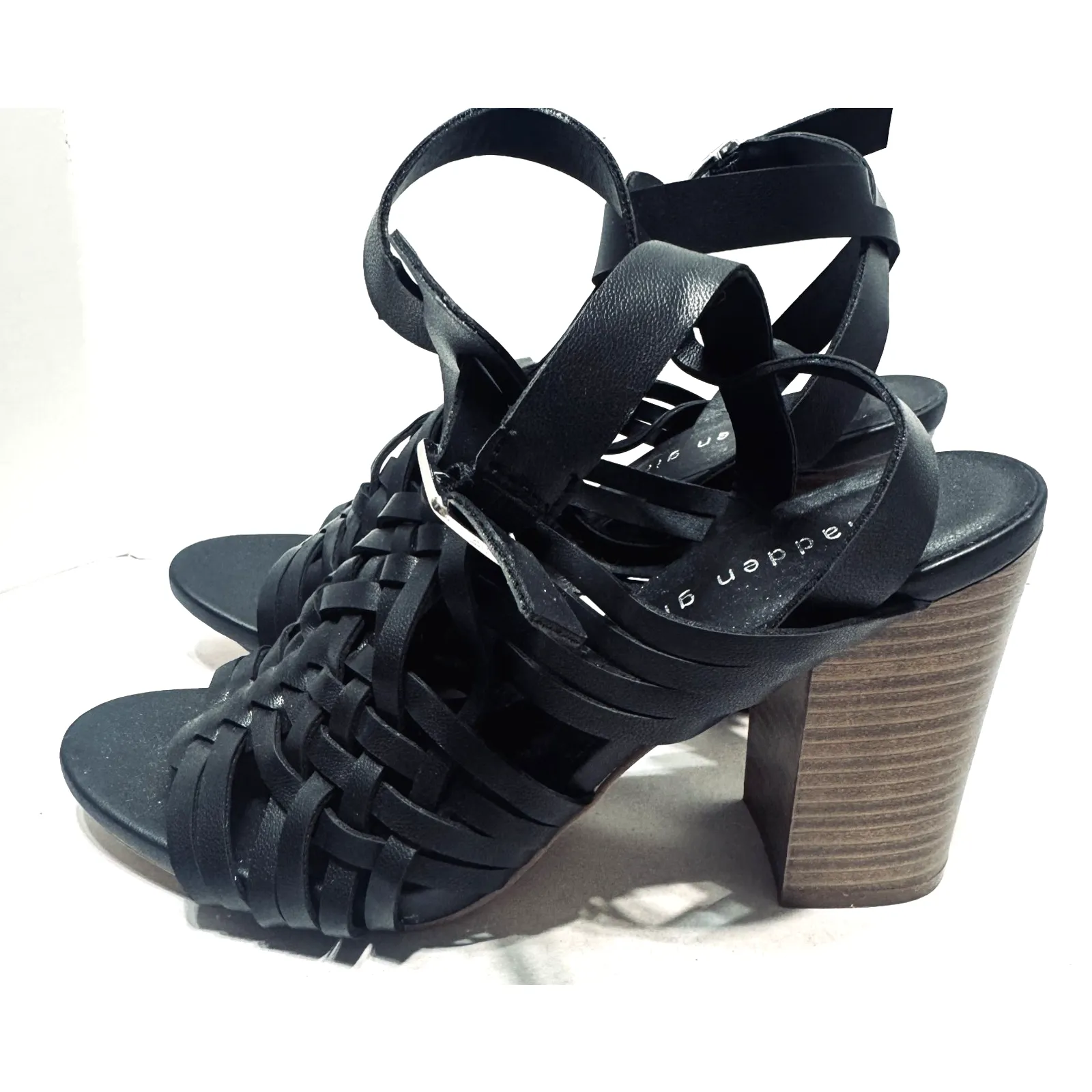 Madden Girl Black Strappy Heels Sandals sz 8 faux leather block heels excellent used condition No si... Show more