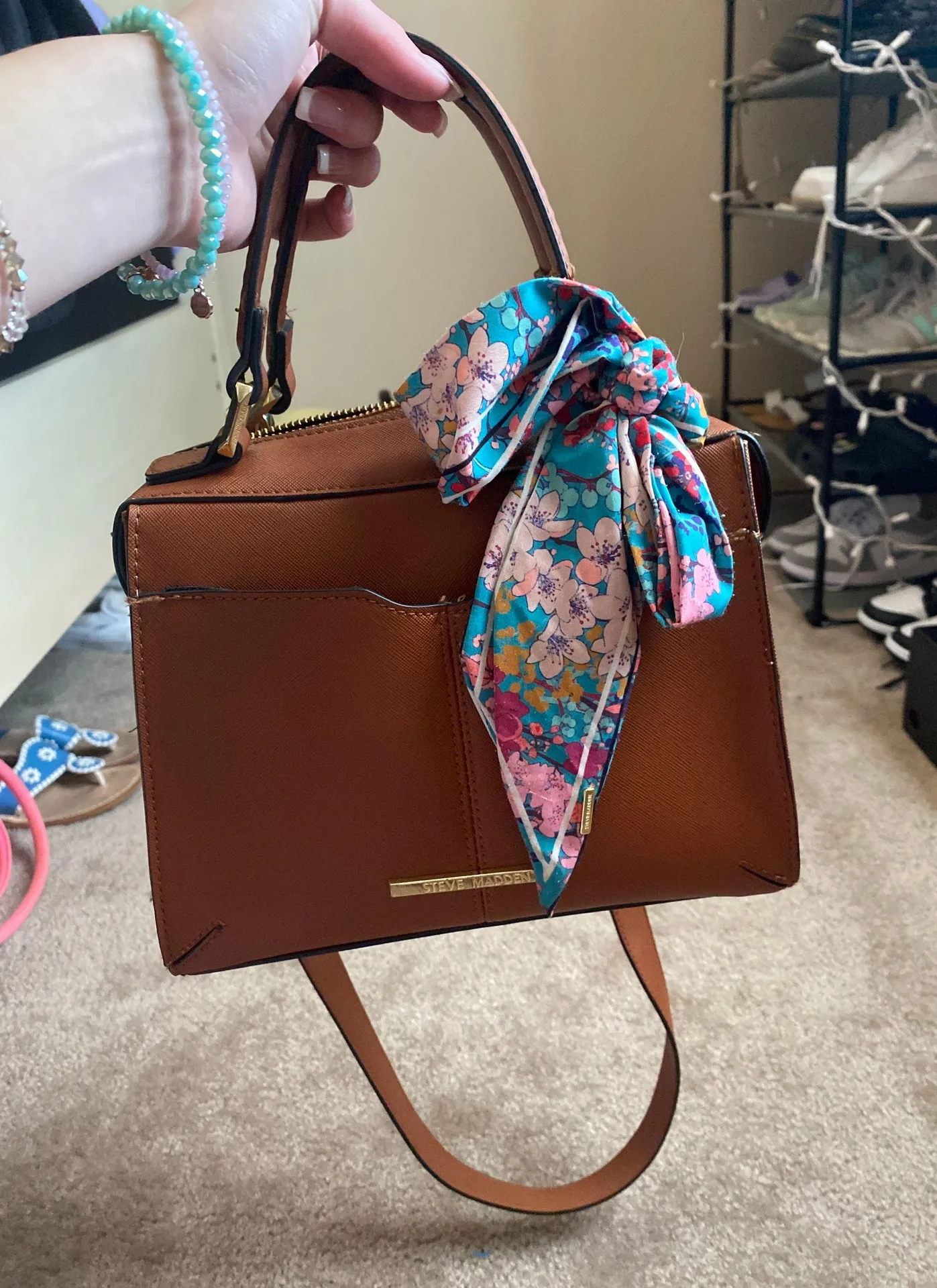 •dark tan color with tie around scarf •bigger strap can come off •scarf can be removed •amazing c... Show more