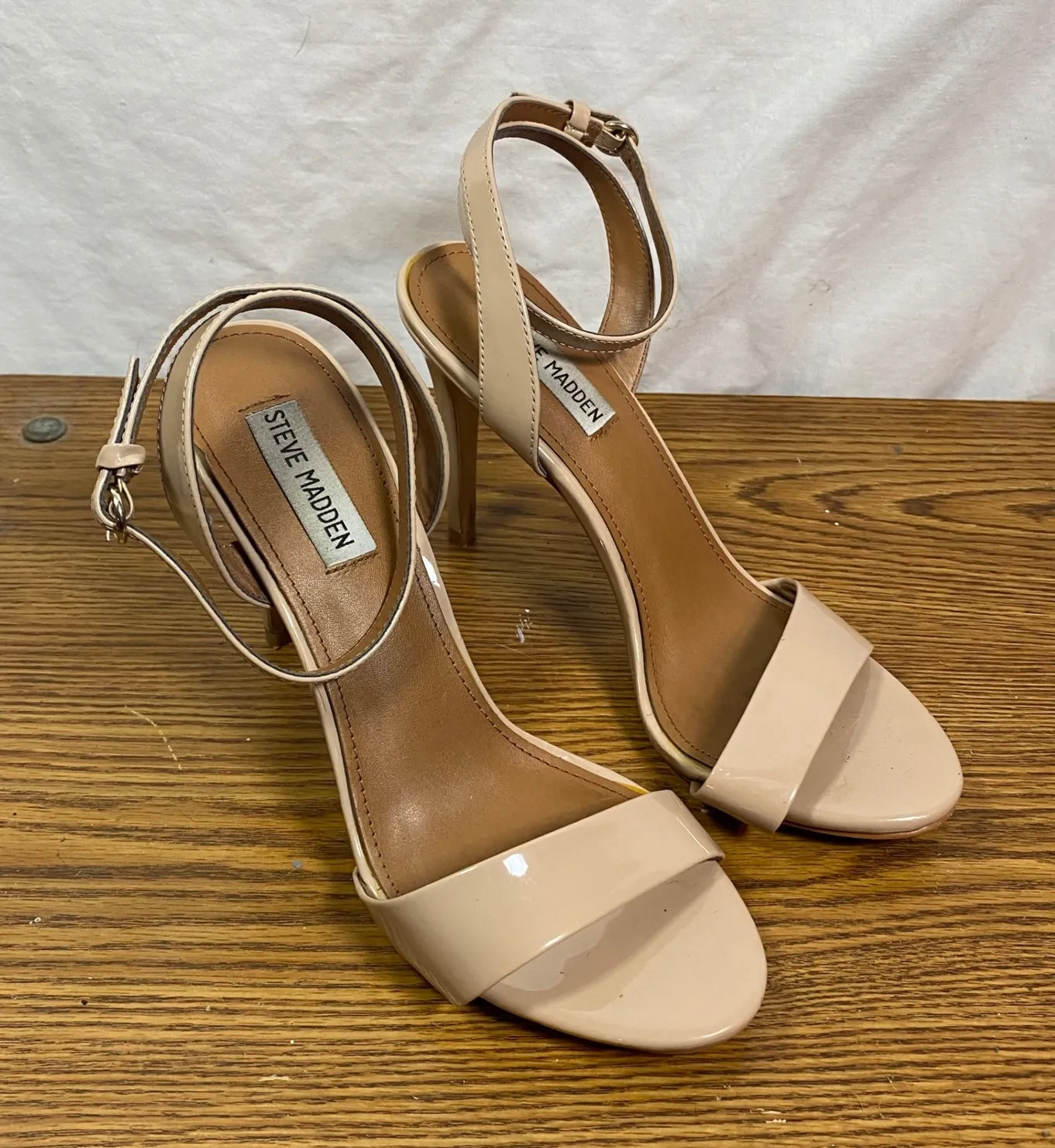 Keywords: Steve Madden, Reno Heels, Ankle Strap Heels, Nude Heels, Beige Heels, Stiletto Heels, Dress Heels, Party Heels, Women's Heels, Size 9.5M, Formal Heels, Evening Heels, Classic Heels, Minimalist Heels