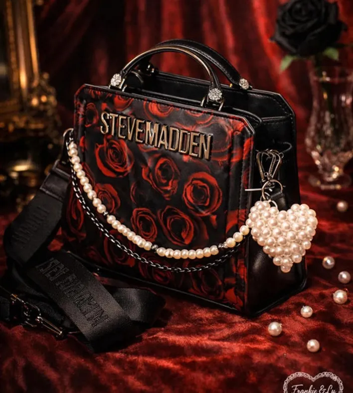 Bold and romantic Steve Madden satchel crossbody featuring an allover red rose print on a sleek blac... Show more