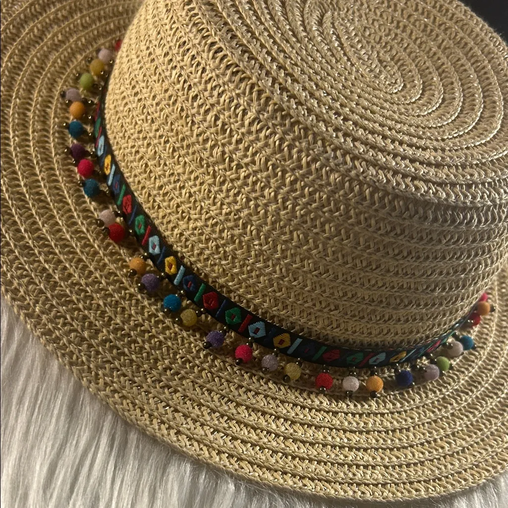 Very Good Used Condition Steve Madden Colorful Pom-Pom Straw Hat Stylish straw hat with a vibrant b... Show more