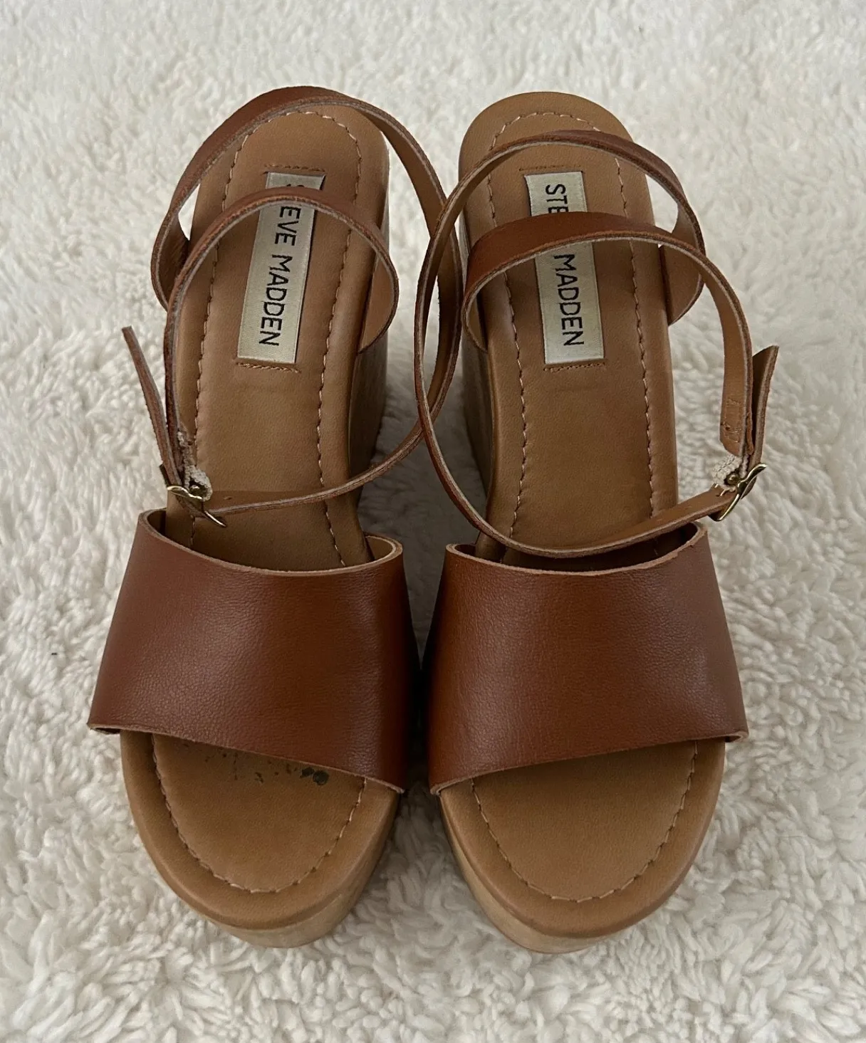 These Steve Madden Women's Camel Leather Ankle Wrap Wedge Heel Sandals in size 6 are a stylish and t... Show more