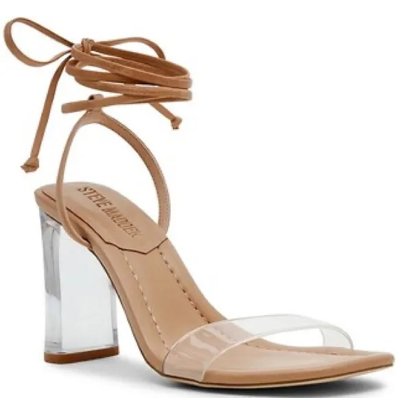 Elegant wrapping ankle ties pair with translucent block heels adding gorgeous lift to a dressy look... Show more