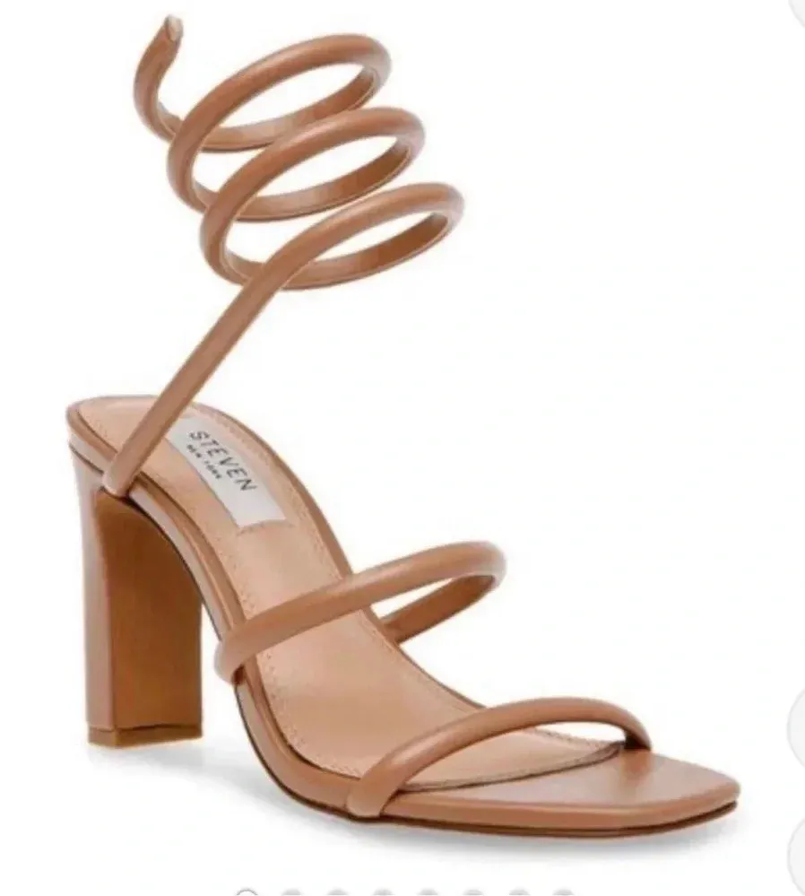 New with blemish on upper of back heel Size 11 Open toe sandal Wrap Around ankle strap Synthetic upper Approximately 3.5” heel Comes from smoke free environment Ships next business day