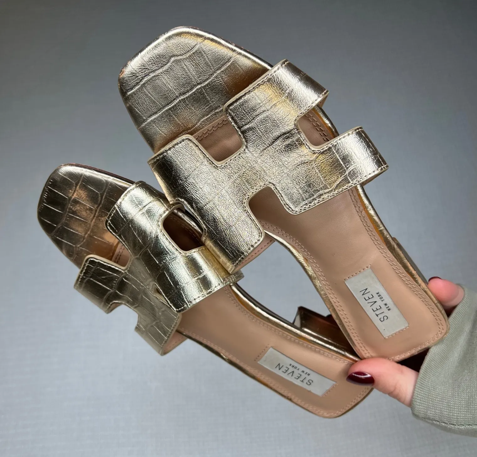STEVEN NEW YORK gold metallic slip-on slide sandals. These sandals feature a chic crocodile embosse... Show more