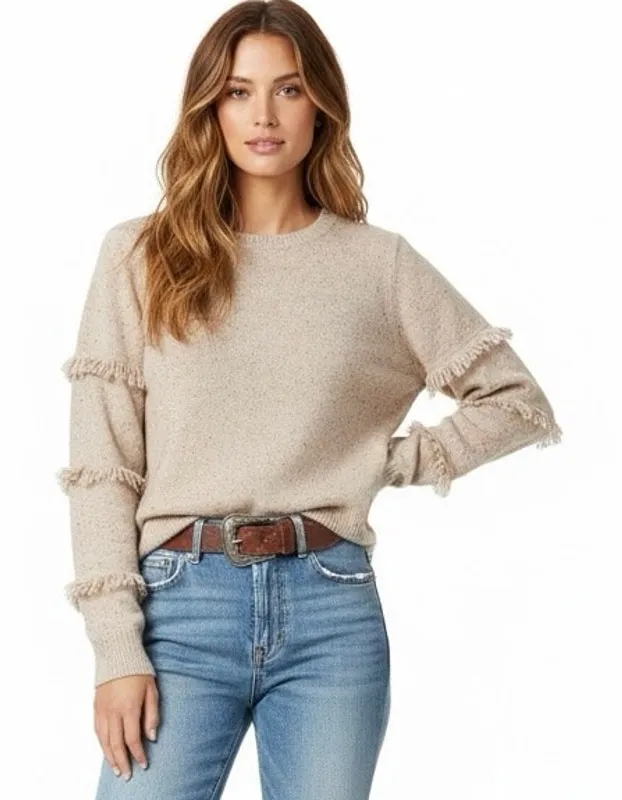 100% cashmere Crew neck Pullover Long sleeves Fringe detail Ribbed cuffs and hem Heathered Soft knit Lightweight Slightly relaxed; boxy fit *measurements are approximate* Pit to pit: 18.5" Sleeve length: 23.5" Length: 23" Bohemian; Minimalist; Cozy; Cottagecore; Scandinavian; Earthy; Grandmacore; Soft; Neutral; Boho; Western