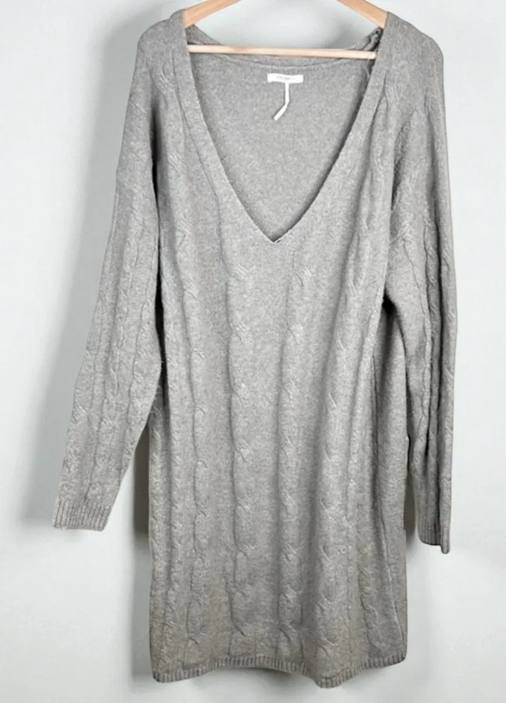 The Stitchdrop sweater dress is a versatile piece for women, featuring a V-neck style and long sleeves. Made from soft knit material, it offers comfort and is suitable for both casual and formal occasions. The dress is knee-length and comes in a regular size M, in a muted gray color, ideal for the fall season. Condition: New without tags Does have a small gap in the seam at the neck Brand: Stitchdrop Size: M Style: V-Neck, Knit, Sweater Dress Dress length: Knee Length Color: Gray Department: Women Sleeve length: Long Sleeve Occasion: Casual, Formal Material: Knit Season: Fall Features: Soft, Comfortable Measurements approximately: Underarm to underarm 23 Total length from shoulder 38.5 Smoke Free Environment Flaws will be noted or shown in photos