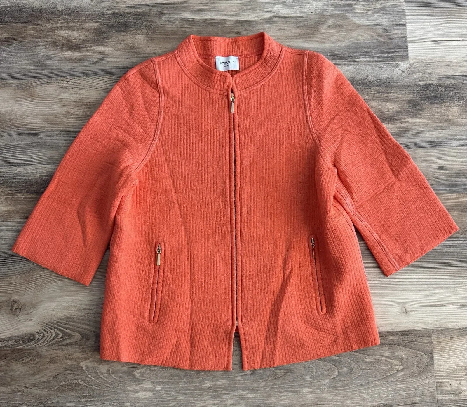 Bright and modern — this Stizzoli jacket features a vibrant orange textured knit with a zip-front design, gold-tone zipper pockets, elbow-length sleeves, and a soft viscose-blend feel. Made in Italy and perfect as a lightweight layer for work or polished everyday outfits. Details: • Brand: Stizzoli • Size: 48 (please refer to measurements) • Color: Orange • Style: Zip-Front Jacket • Features: Textured knit, gold-tone zipper pockets, elbow sleeves, split hem • Material: 80% Viscose / 15% Polyester / 5% Elastane • Made in Italy Approx. Measurements (laid flat): • Armpit to Armpit: 21.5” • Sleeve Length (shoulder to cuff): 19” • Front Length: 26” • Back Length: ~25” Condition: Good pre-owned condition. Some signs of wear and visible fraying throughout — please see photos. Most items I sell are thrifted or secondhand and may have a light laundry detergent scent. All items come from a smoke-free, pet-friendly home. Feel free to make offers or ask questions!