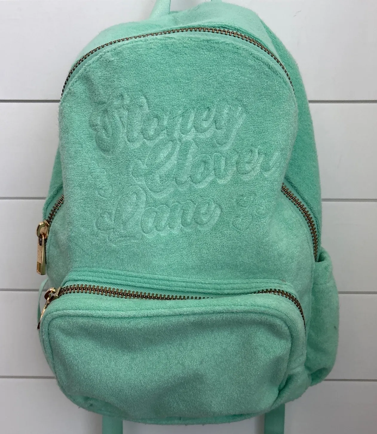 Carry your essentials in sweet style with this delightful Stoney velour backpack. The plush mint green fabric offers a luxurious feel, while the embossed floral design and shimmering gold zippers add a touch of playful glamour. Adjustable straps ensure comfortable wear for this charming accessory, perfect for a day out shopping or a weekend getaway. Measurements: • Width: 11 in • Height: 13 in • Depth: 5 in Exterior Material: Polyester Style: Backpack Exterior Color: Emerald Green Department: Women Product Line: Betsey Johnson Be Mine Lining Color: Green Handle/Strap Material: Nylon, Polyamide Fiber Handle/Strap Color: Green Lining Material: Fabric Hardware Color: Gold Pattern: Solid Closure: Zip Bag Width: 10 in Keywords: velour, mint green, gold zipper, floral embellishment, plush, designer, fashion backpack, cute, everyday bag, travel accessory, gift idea