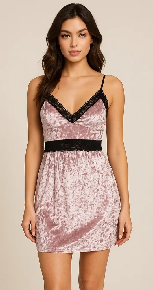 Turn heads with this Storia crushed velvet pink slip mini dress. Featuring delicate black lace trim,... Show more