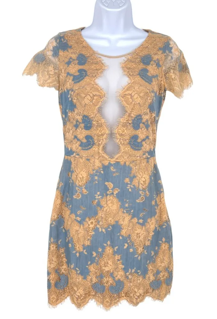 This Storia mini dress features a fitted silhouette with intricate floral lace detailing in blue and... Show more