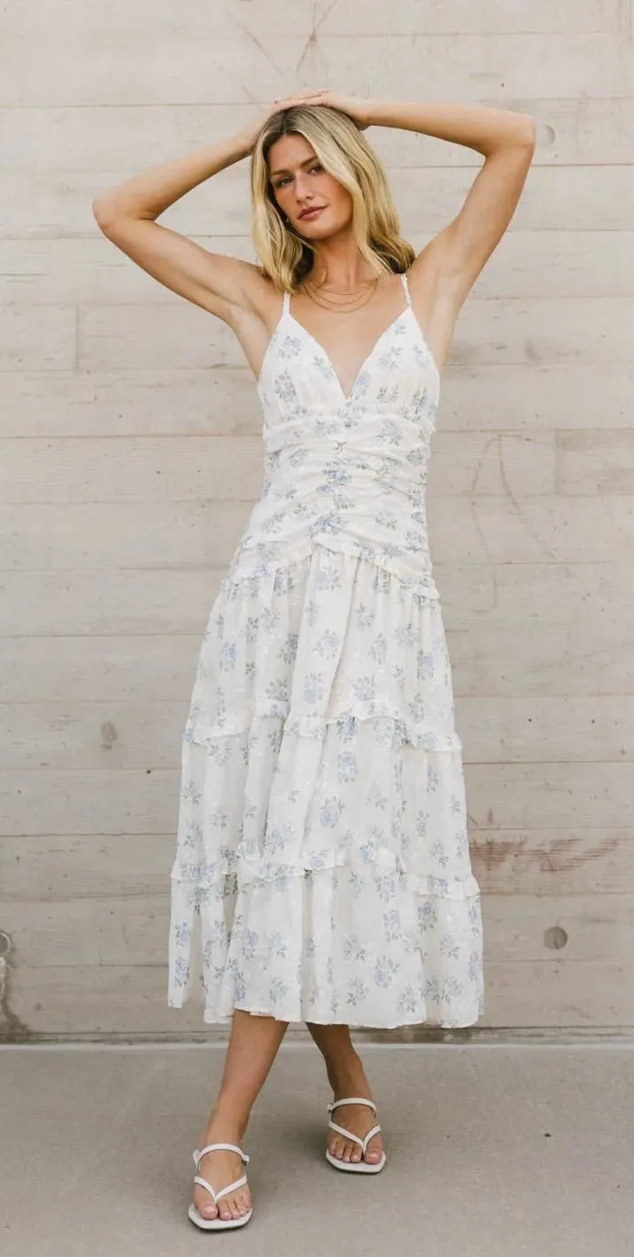 Romantic floral midi dress, perfect for any spring or summer occasion. Features an all-over delicate blue floral print on a cream-white base. It boasts a flattering V-neckline, a ruched bodice that accentuates the waist, and adjustable spaghetti straps for a custom fit. The dress cascades into a tiered midi skirt with charming ruffle detailing. This dress is perfect for a garden party, a casual brunch, or a summer wedding.