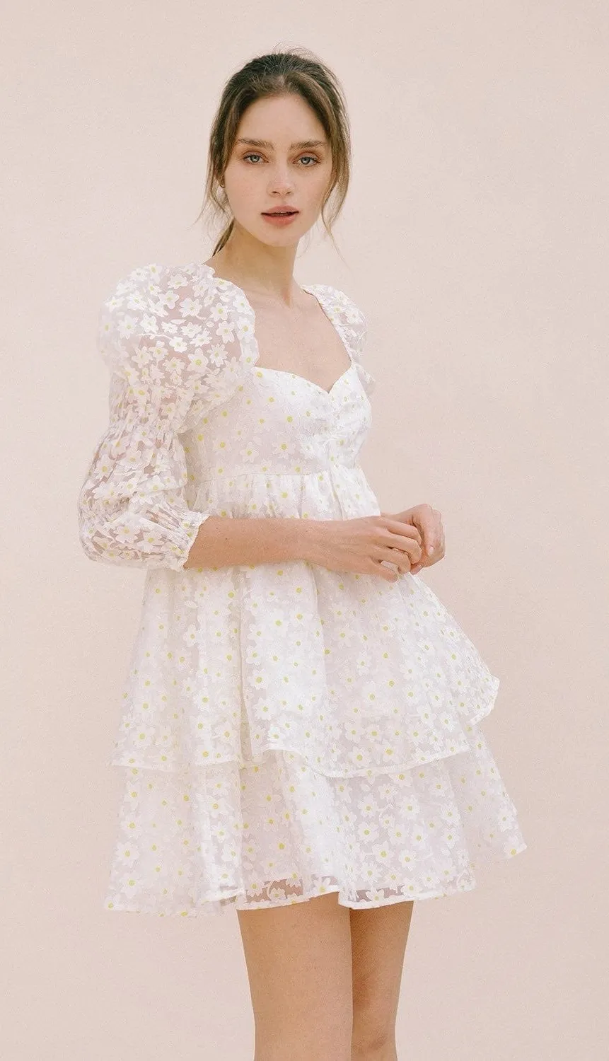 Adorable and statement-making, this Storia daisy mini dress features sheer puff sleeves, a tiered sk... Show more
